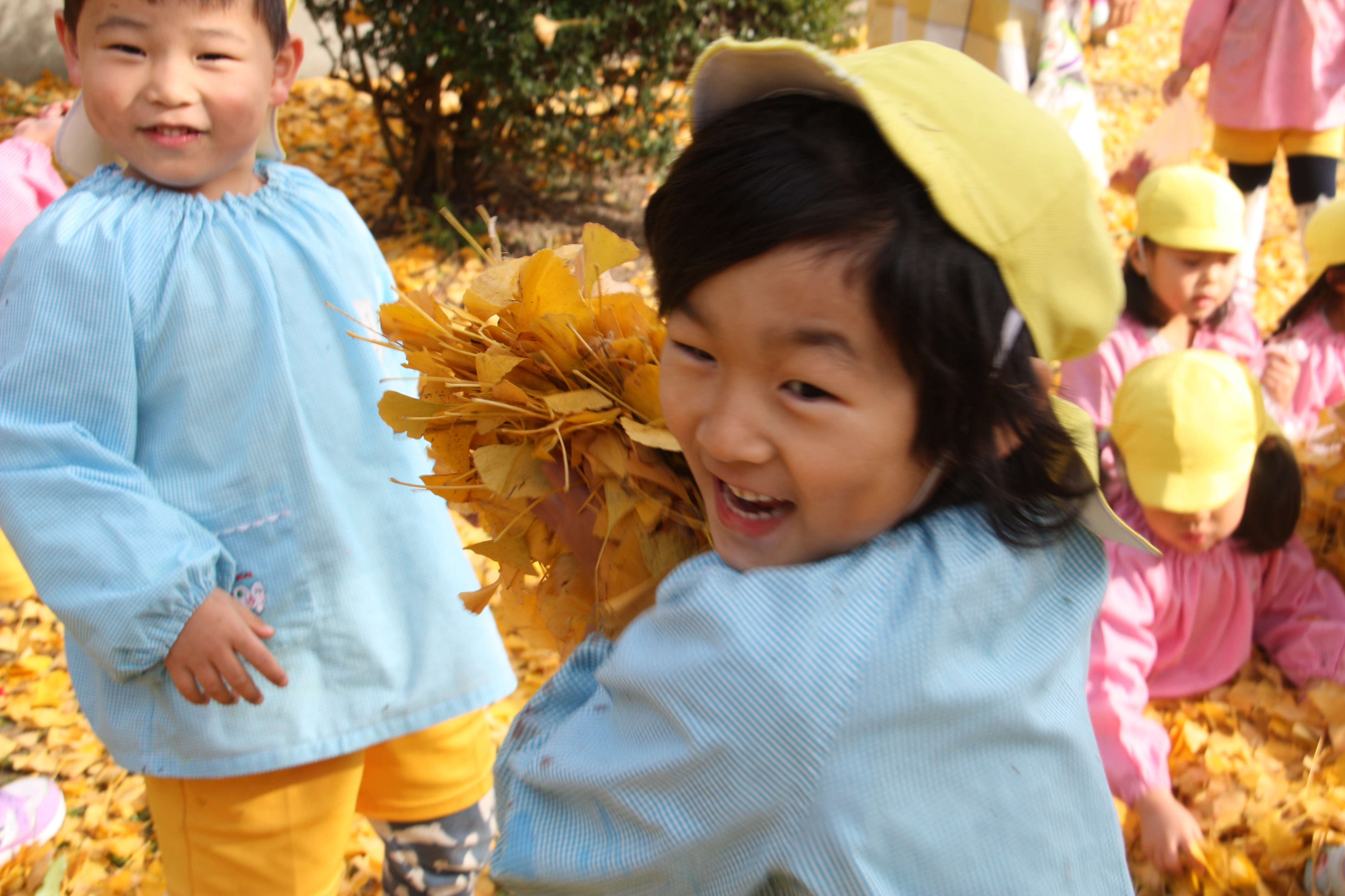 今日はぱんだ組さんが園長先生の家の大きなイチョウの木に向いました!イチョウの葉であたりいちめんが黄色いじゅうたんのようです!子どもたちは目を輝かして葉っぱを集めたり、葉っぱをおふとんにしたり、思い思いに遊びました。赤いもみじの木も近くにあったので一生懸命赤い葉を集めている子もいましたよ!